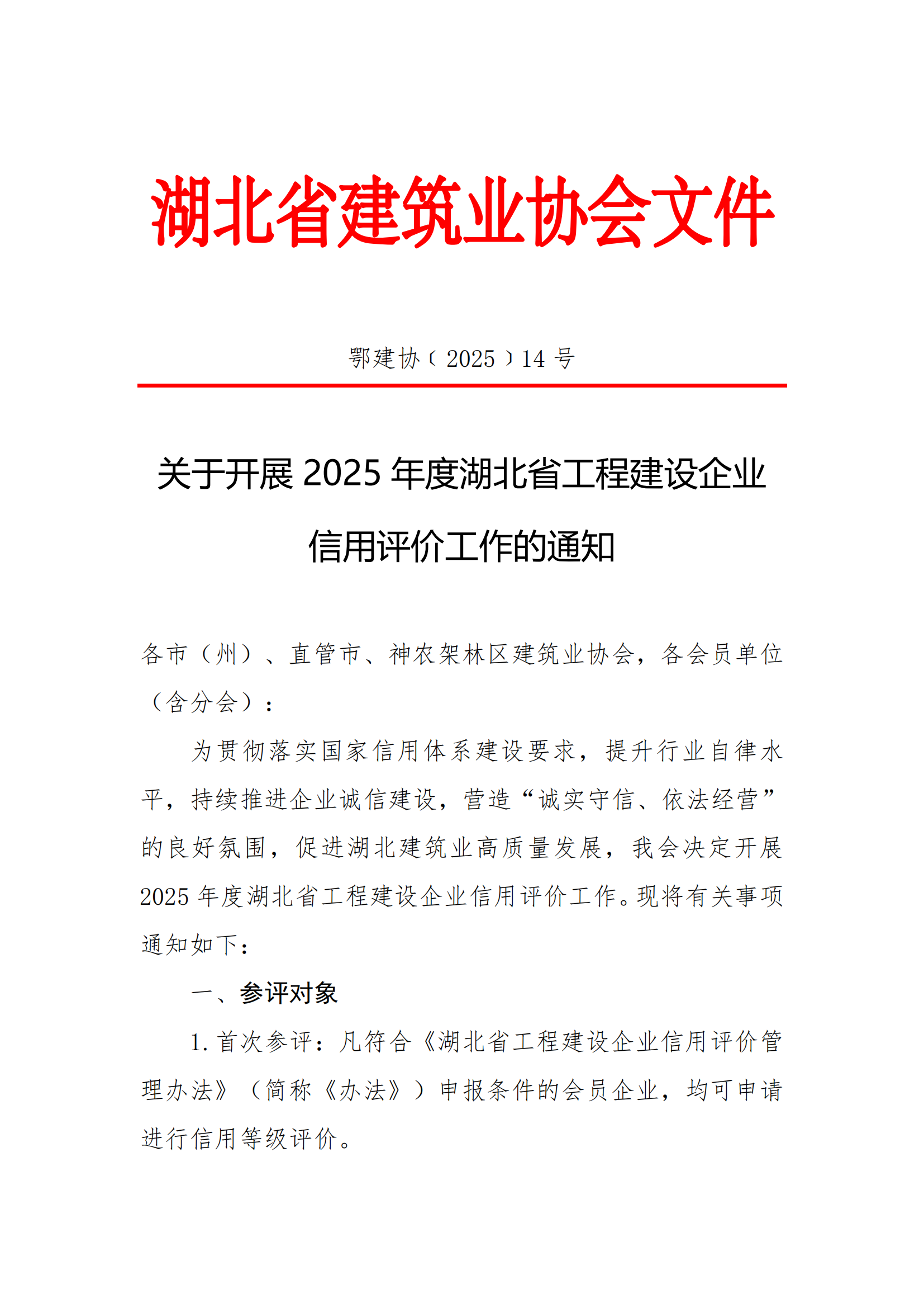 關(guān)于開展 2025 年度湖北省工程建設(shè)企業(yè)信用評價工作的通知