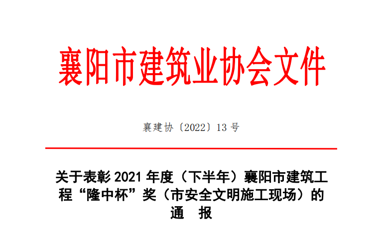 關(guān)于表彰2021年度(下半年)襄陽(yáng)市建筑工程“隆中杯”獎(jiǎng)(市安全文明施工現(xiàn)場(chǎng))的通報(bào).pdf 【查看全文】