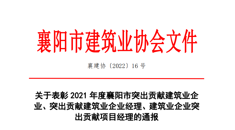 關(guān)于表彰2021年度襄陽(yáng)市突出貢獻(xiàn)建筑業(yè)企業(yè)、突出貢獻(xiàn)建筑業(yè)企業(yè)經(jīng)理、建筑業(yè)企業(yè)突出貢獻(xiàn)項(xiàng)目經(jīng)理的通報(bào).p... 【查看全文】