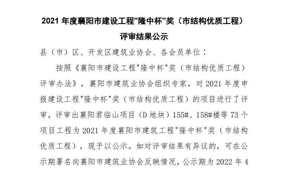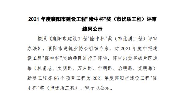 2021年度襄陽市建設工程“隆中杯”獎(市結構優質工程)評審結果公示.pdf 【查看全文】