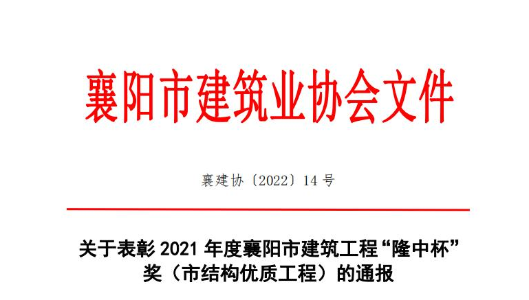 關于表彰2021年度襄陽市建筑工程“隆中杯”獎(市結構優質工程)的通報.pdf 【查看全文】