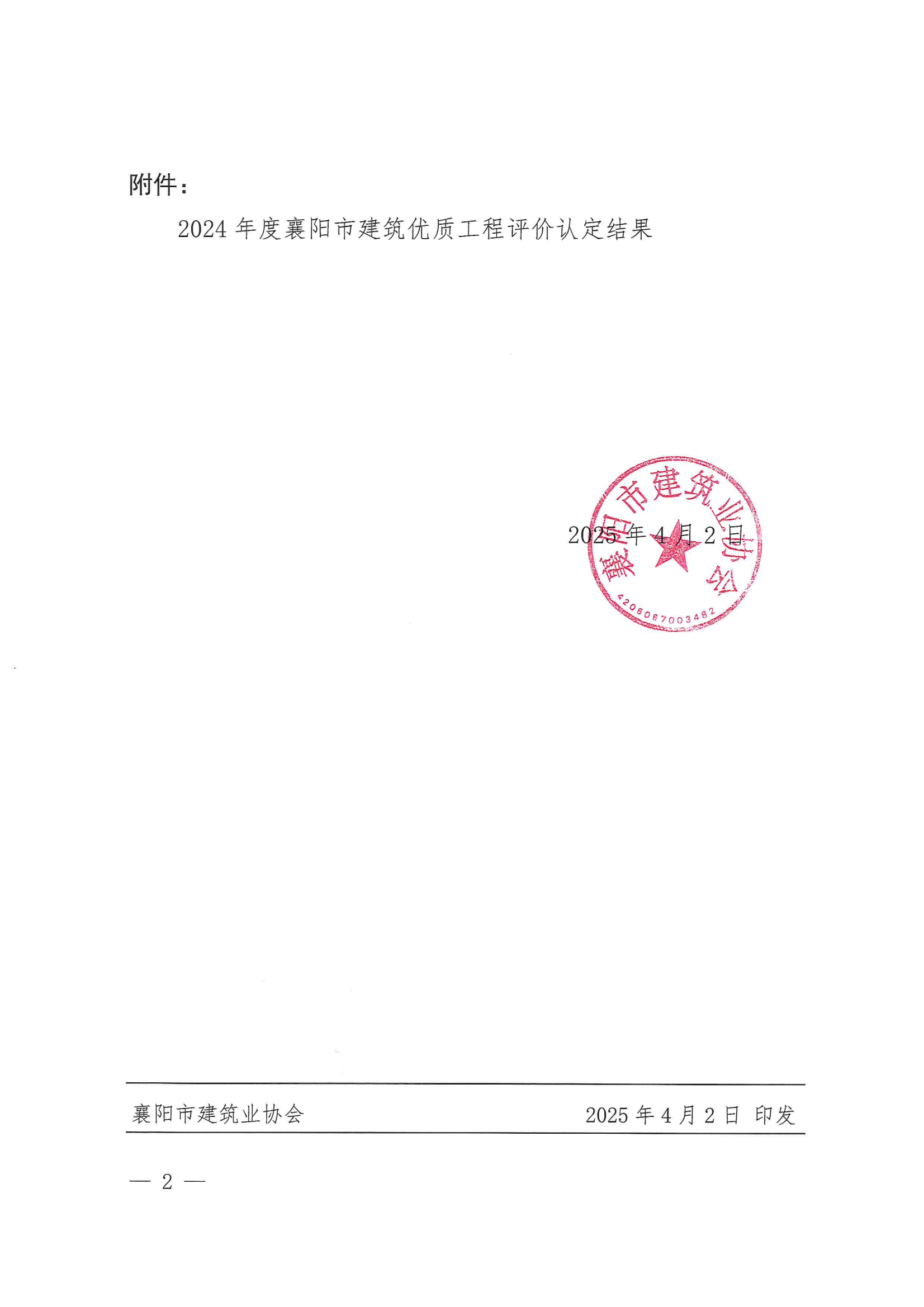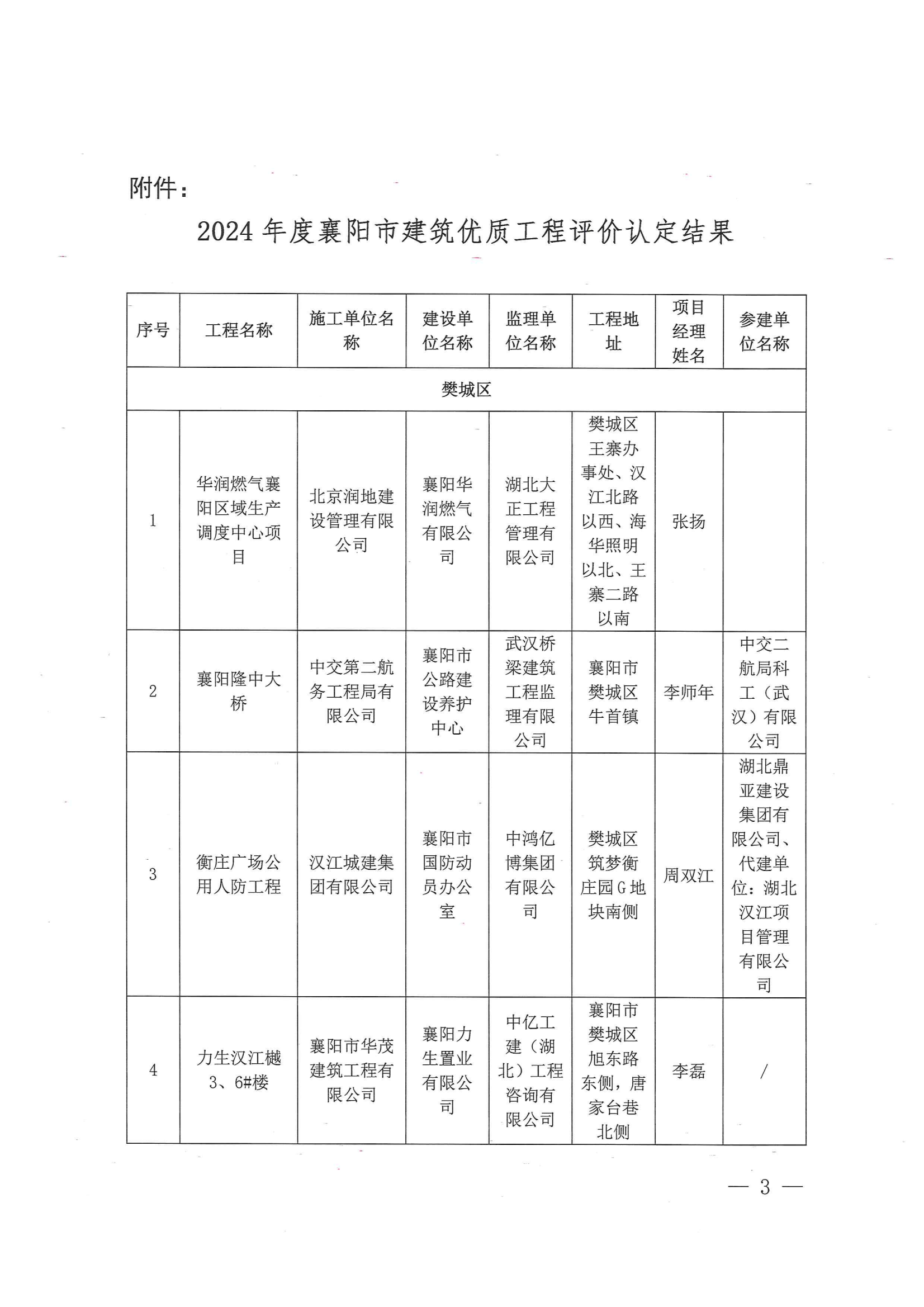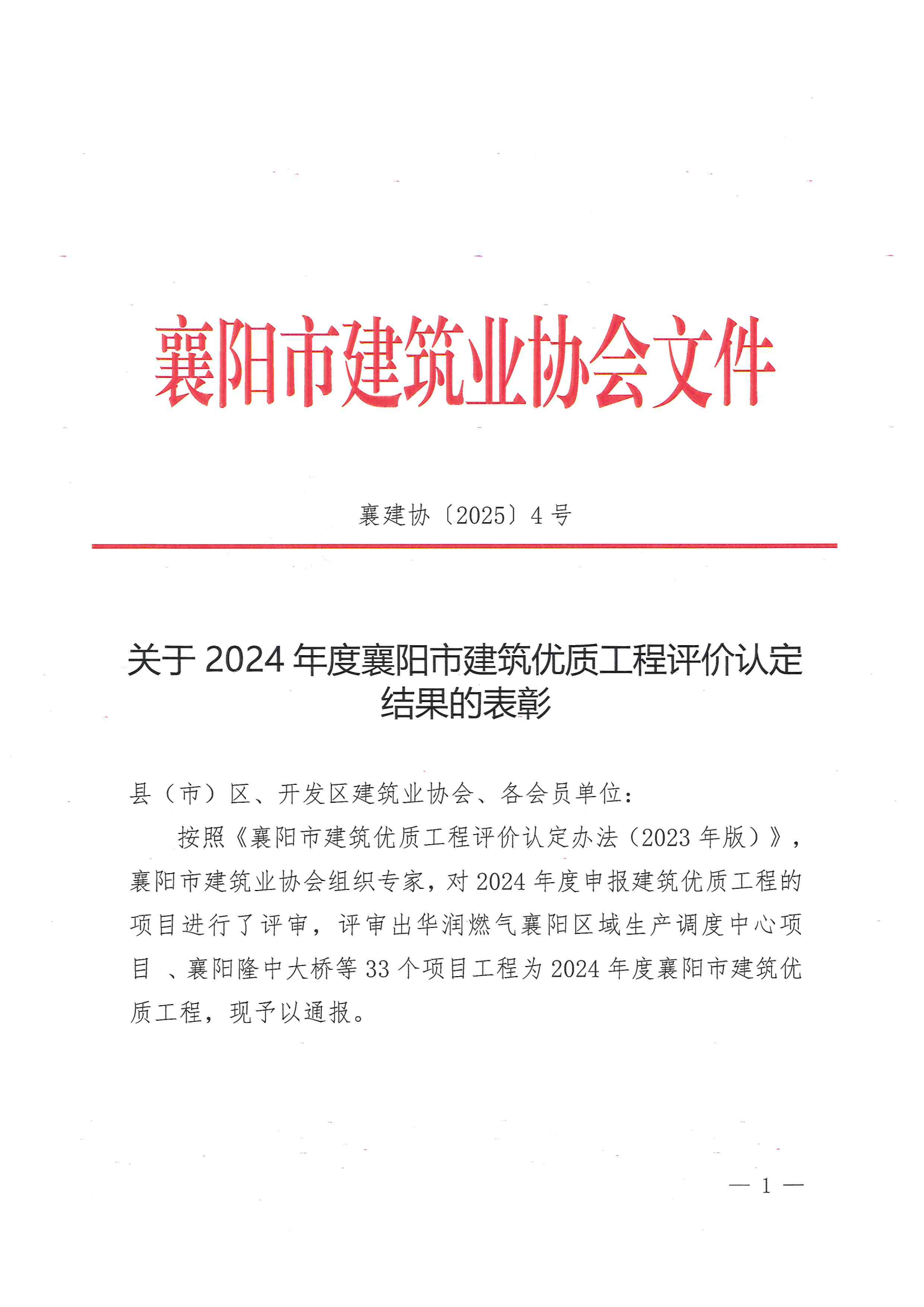 關(guān)于2024年度襄陽市建筑優(yōu)質(zhì)工程評價(jià)認(rèn)定結(jié)果的表彰
